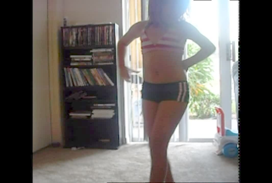 Young girl in a bikini dances in the house to music. Small black dog looks like he's dancing too when he scratches his back on the coffee table. Itch. Clip shot sideways.