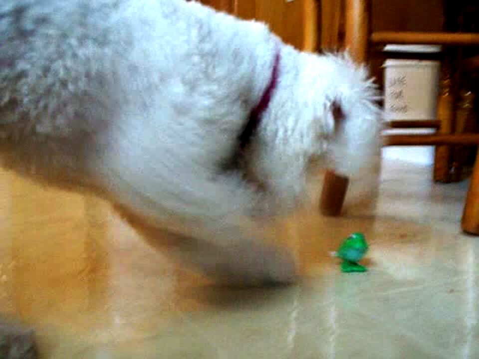 White poodle dog scratches rapidly at tiny green plastic toy hopping around on the kitchen floor.