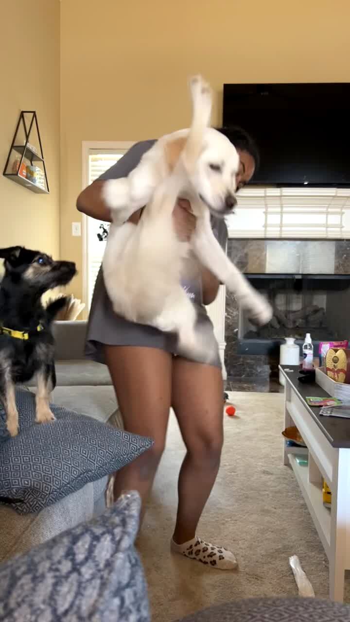 A teen girl holds a yellow Labrador retriever dog in a living room, and the dog swings her back legs frantically around in midair.