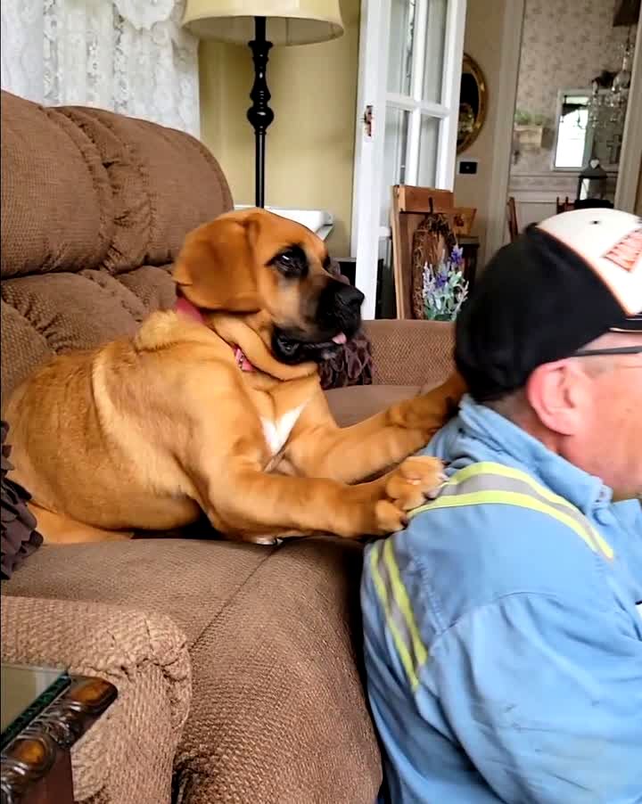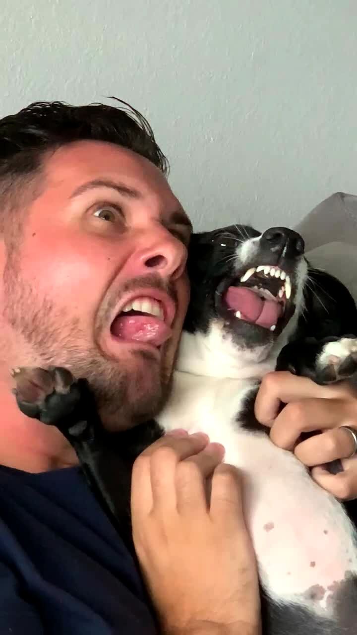A man and a dog cuddle at home, then they both show their teeth for a second and go back to cuddling.