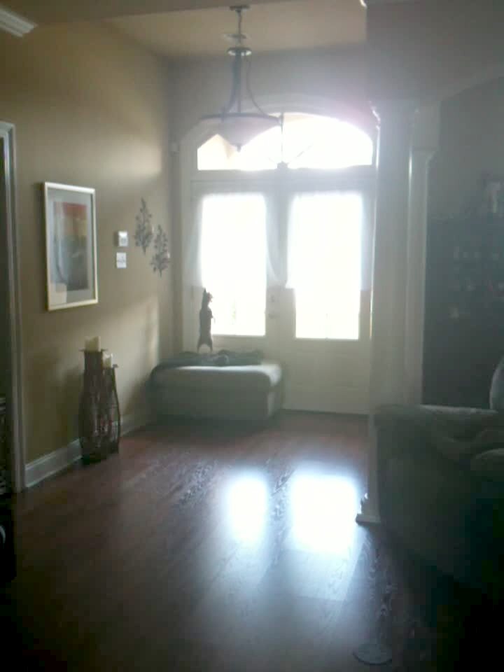 Little dog jumps up and down on sofa to look out window, looks like it's on pogo stick. Shot from across room.