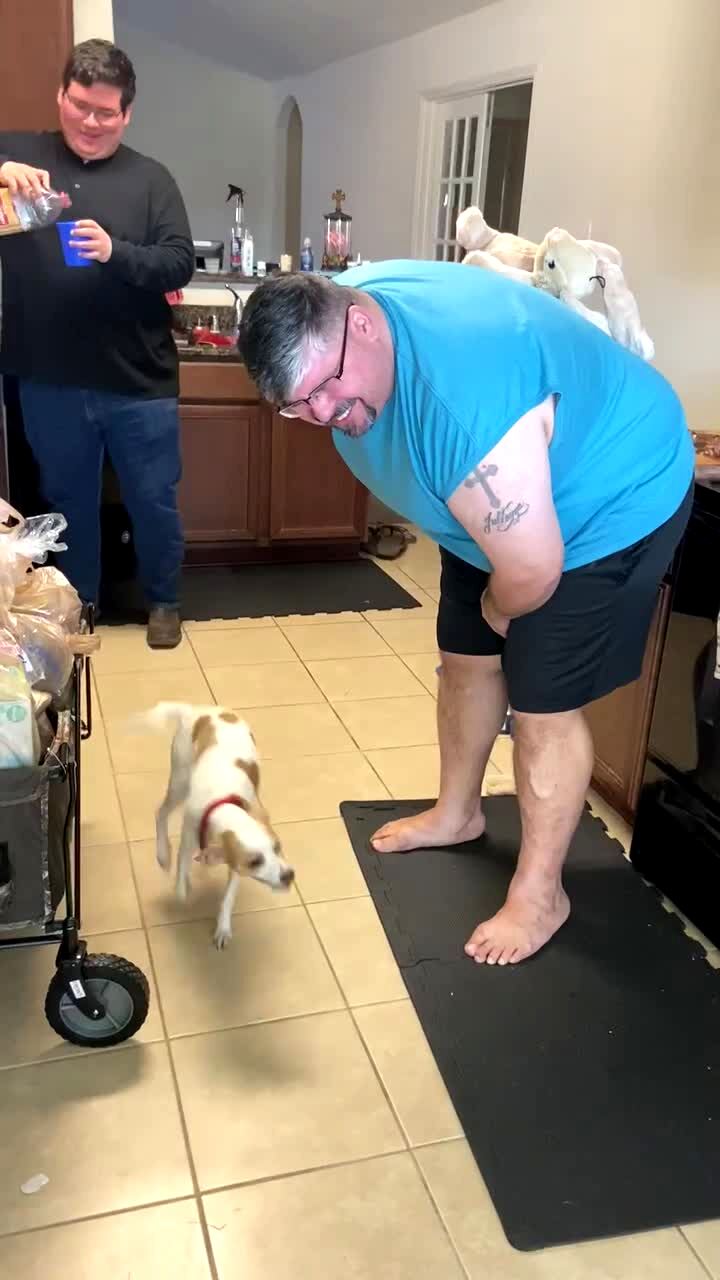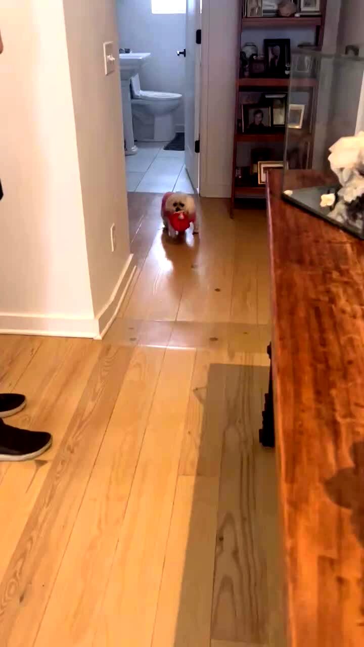 Small dog is afraid of the kitchen floor and does a funny walk through the kitchen. Woman calls to her over and over.