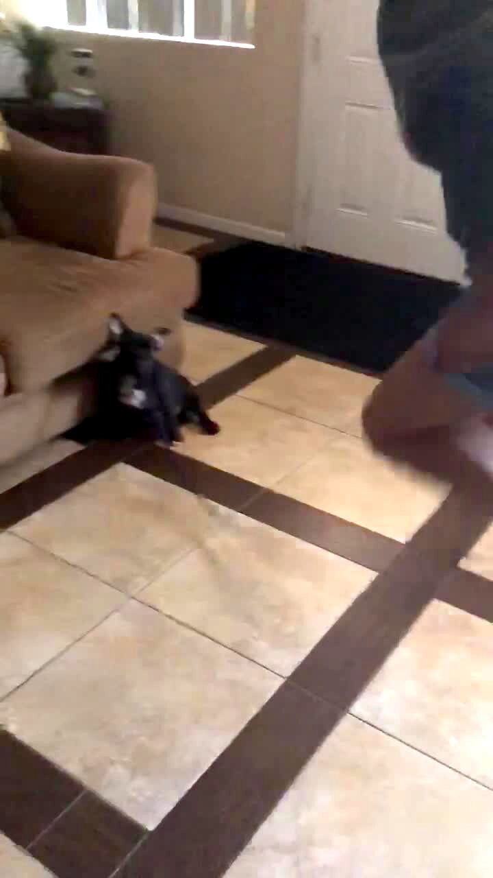 Black puppy dog tries to jump up on couch to get toy, can't get reach.
