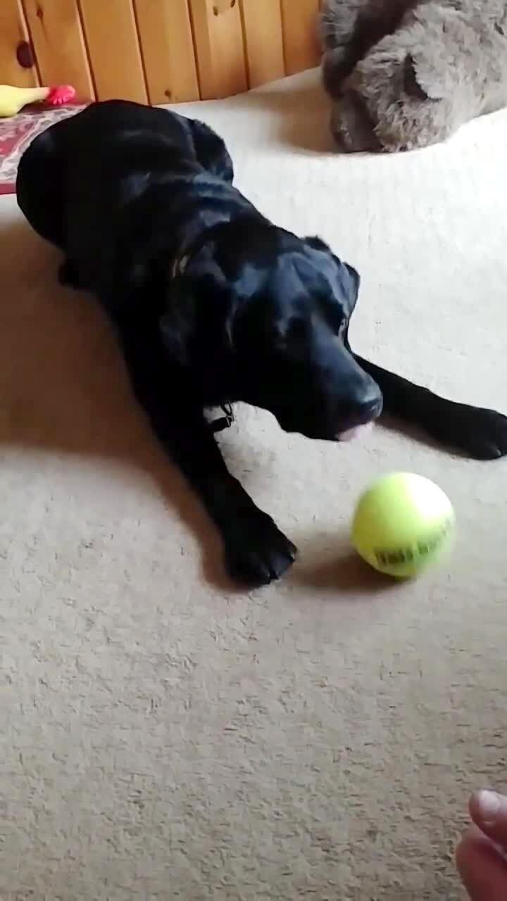 A labrador puppy dog licks a tennis ball to roll it back to a woman indoors.