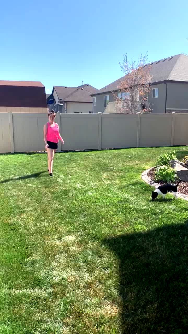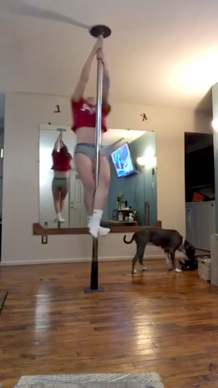A woman dances and spins on a stripper pole. The pole falls over and she lands on top of her dog. Music rights not cleared.