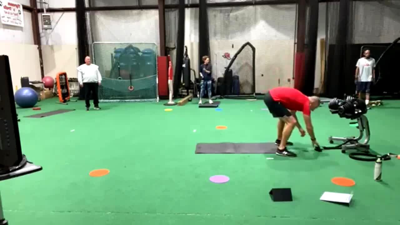 A man in a gym pulls on bands against a weight rack as part of an exercise and the weight rack falls forward and lands on top of him.