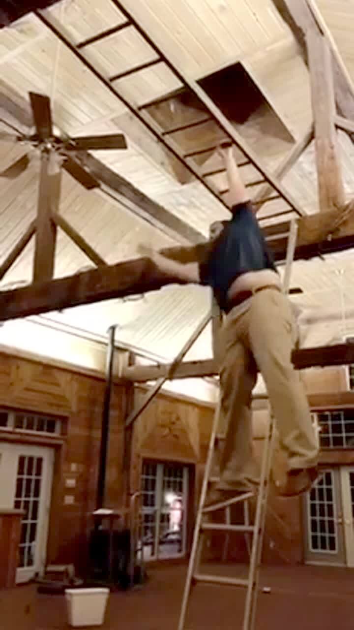 A man tries to swing across a set of metal bars on the ceiling of a room under construction. He falls off onto a step of a ladder and hits his groin and falls onto the ground.