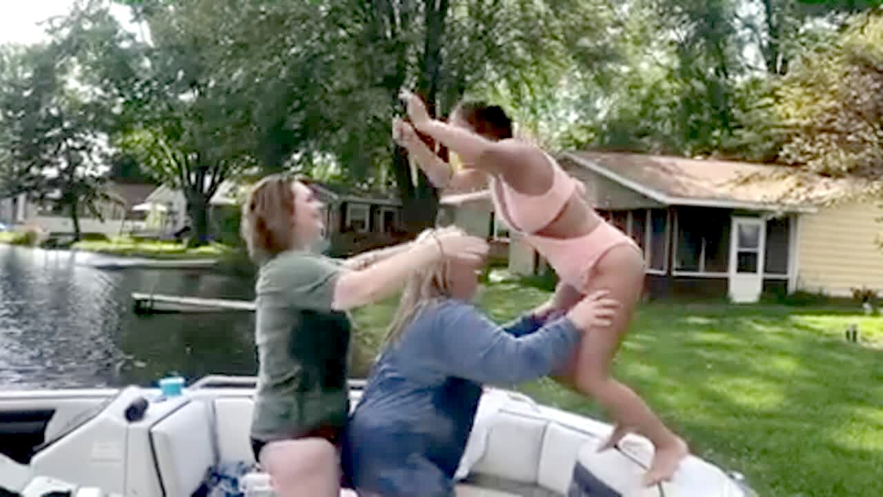 Three women try to reenact the lift scene from Dirty Dancing on a docked boat but when the woman jumps her friend drops her.