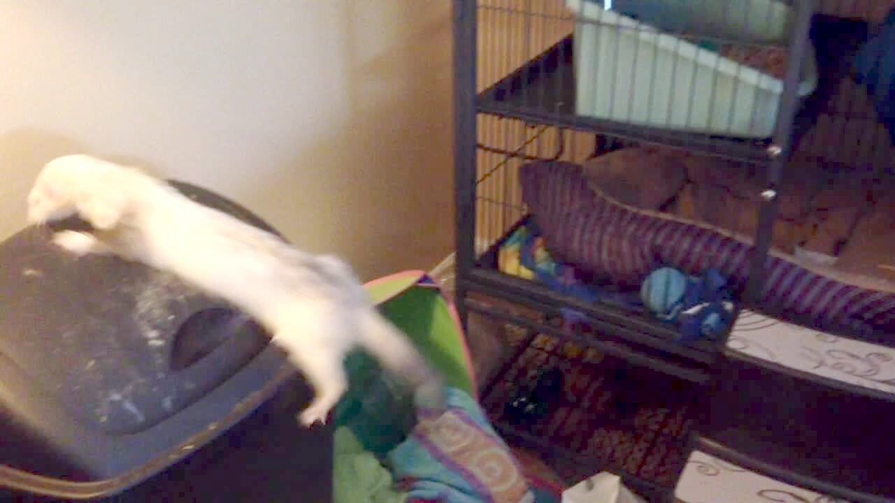 A tot girl cries as she watches a toy dog rolling and laughing on the floor indoors. Her mom calls her from the other side but the girl is unable to walk past the dog. The dog stops moving and laughing and the girl starts walking but the dog turns on again and the girl runs.