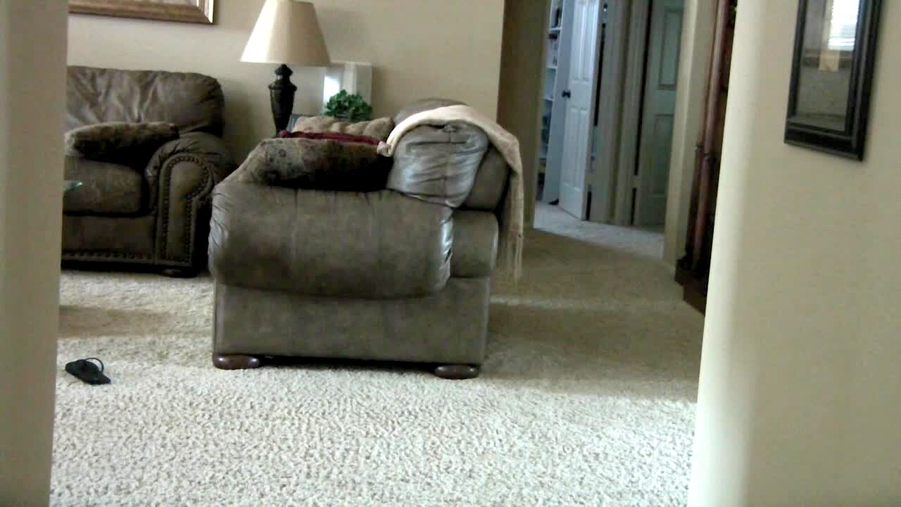 Boy runs back and forth in living room with golden retriever dog attached behind him.