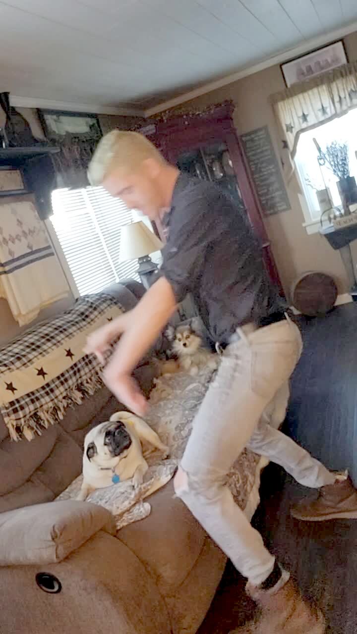 A young man dances to music while a pug dog watches him and wags in a living room.