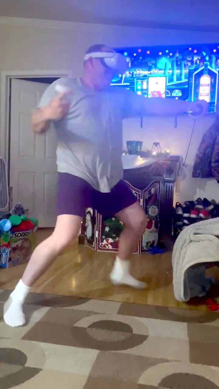 A man punches the air with virtual reality goggles on in the living room. Then a dog barks at him and jumps on his groin.