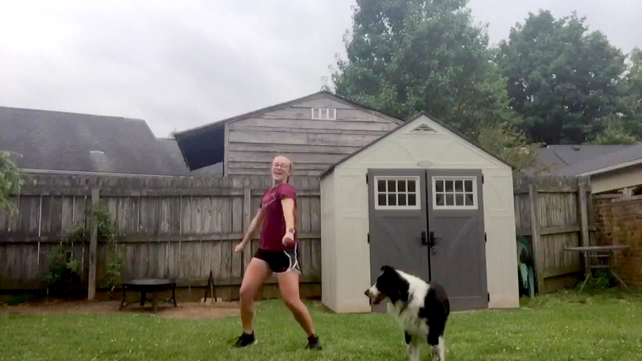 A teen girl practices a dance routine in the backyard and her dog jumps up on her.