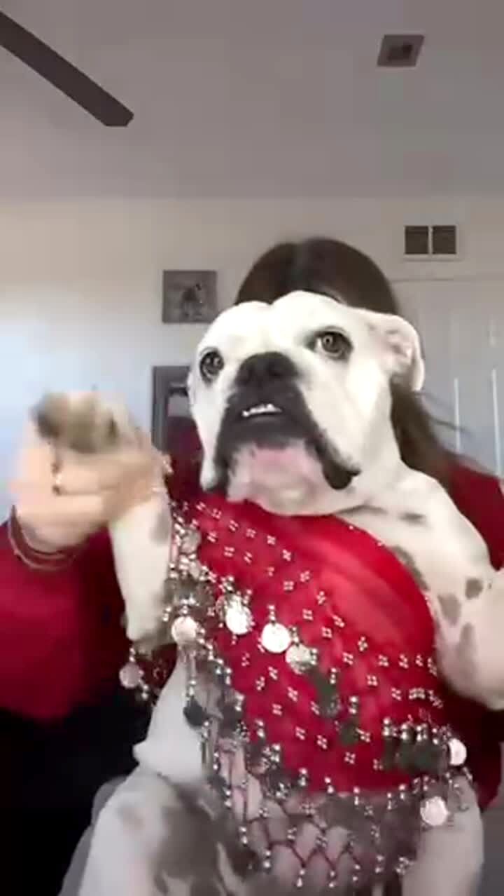 A dog jumps around in front of a toy dog that spins around and plays the Addams Family theme song.