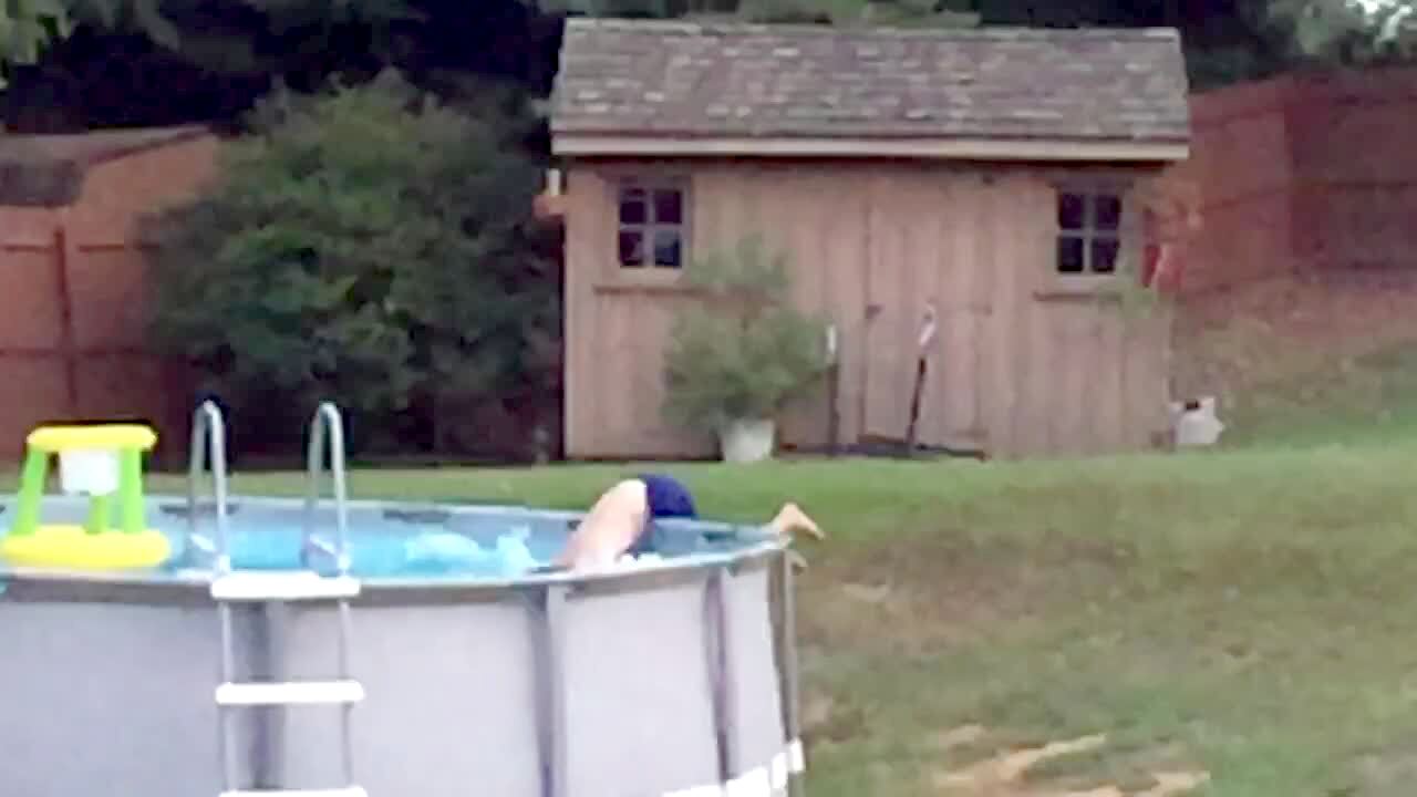 A teen boy runs in the yard and jumps to get into an above ground pool, but he hits his stomach right against the wall.