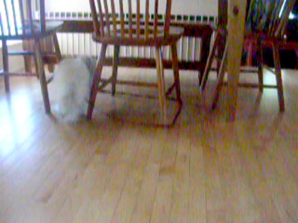 White dog chases leash around chair. Cute!