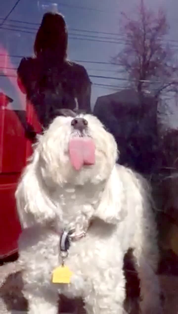 A shih tzu dog inside a glass door licks and bites at the glass, making funny faces.