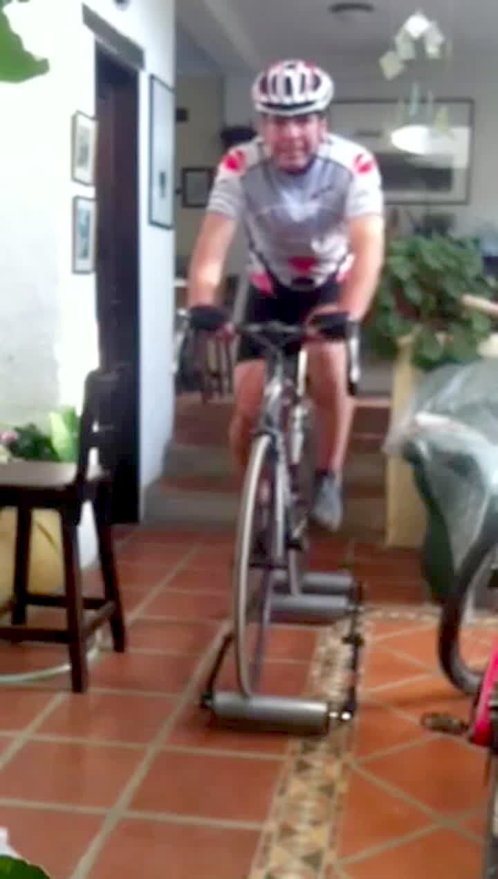 A man rides on a stationary bicycle/ exercise bike indoors while listening to rock music. The tires slip and he falls over.