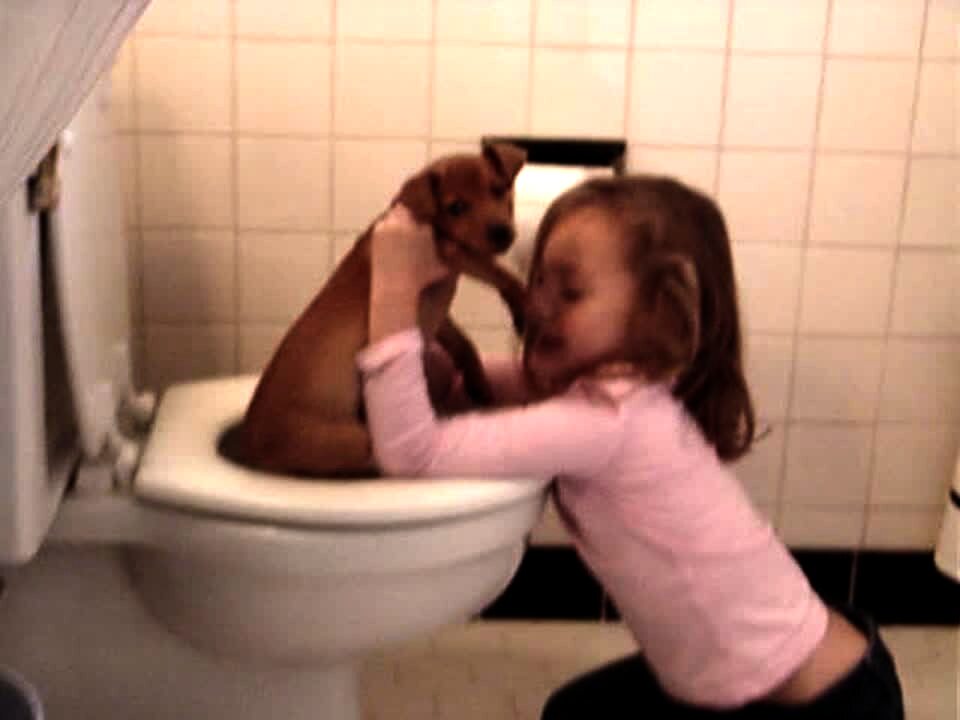 Girl holds cute puppy dog over toilet, trying to potty train it.
