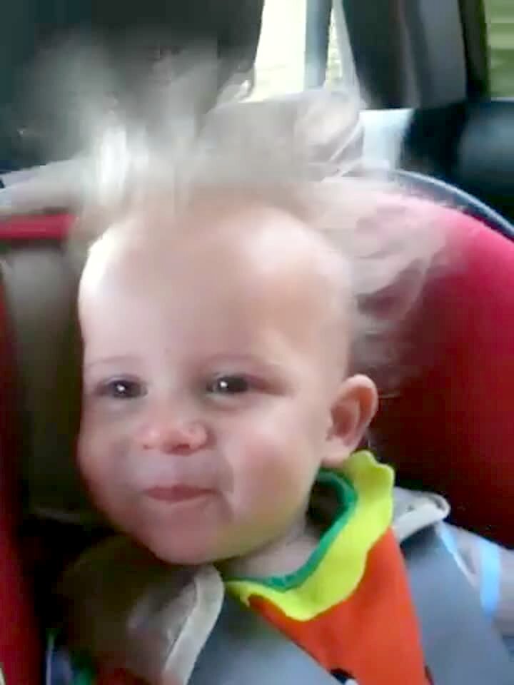 Baby boy in a car seat enjoys the wind in his hair during a car ride. His long blonde hair is blown straight up.