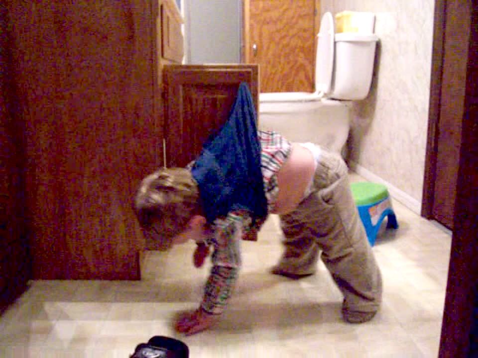 Tot boy cries in the bathroom because his shirt is stuck in the cabinet door and he's hanging there.