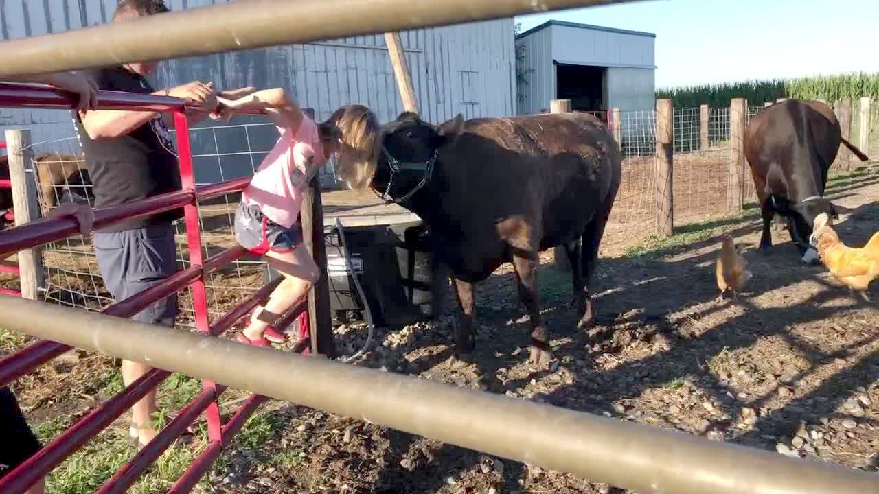 A young girl pets a cow in a farm yard and the cow bumps her with its head and knocks her over.