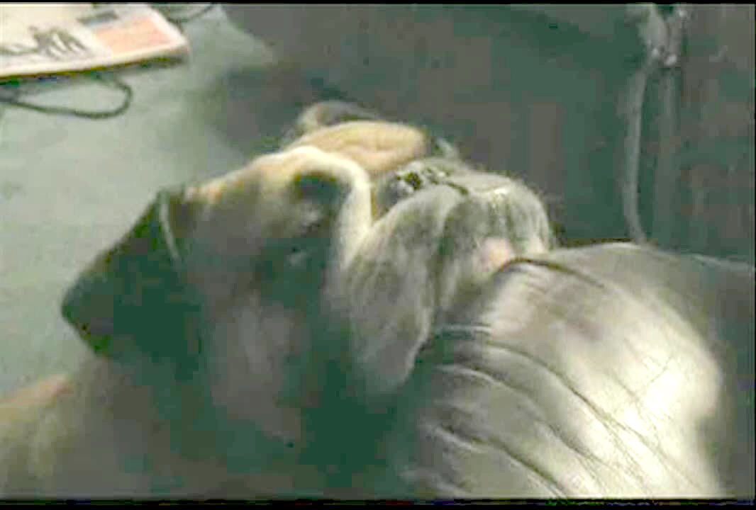 A pug dog sleeps indoors with her eyes open showing only the white part of her eye. A woman wakes her up repeatedly, then lets her fall back asleep as her eyes roll back and show the white parts again.