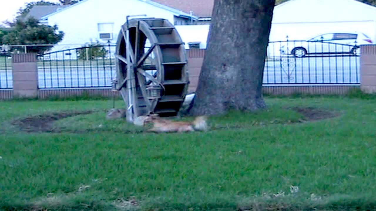 3 small dogs run around a tree in the yard, 2 run in one direction and 1 runs in the opposite direction. Looks synchronized. Funny visual. Long for edit.