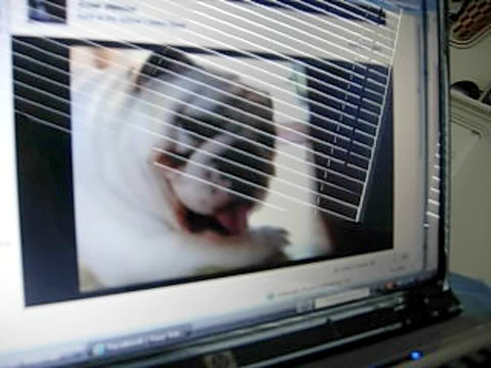Bulldog watches another dog on a computer screen, circles the monitor to see where the dog is. Good close ups of his face