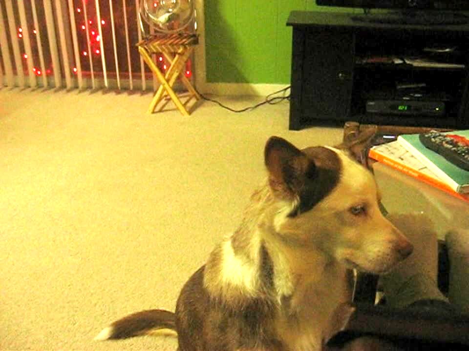 Brown & white dog sways from side to side as it tries to stay awake sitting on the living room floor. Long for edit.