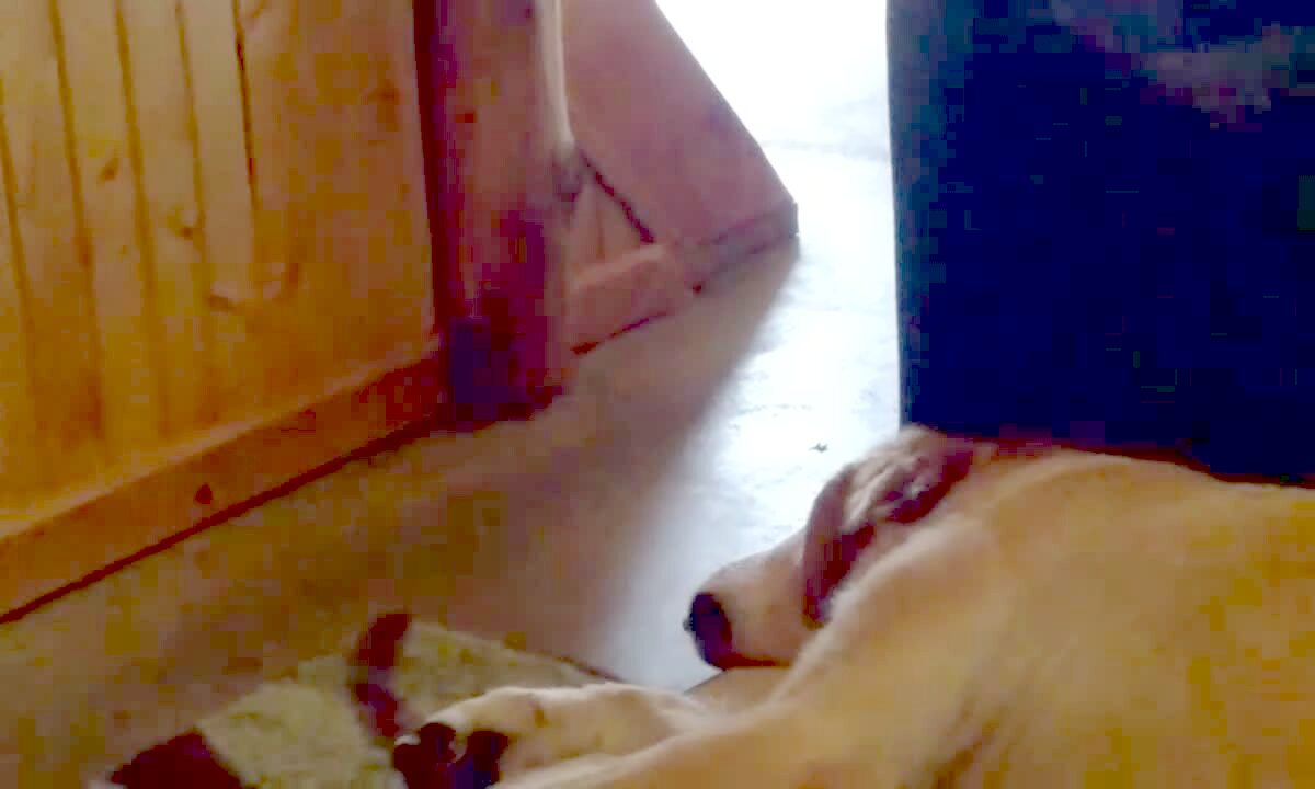 A dog growls and makes a funny noise and his cheeks puff out as he sleeps and dreams indoors.