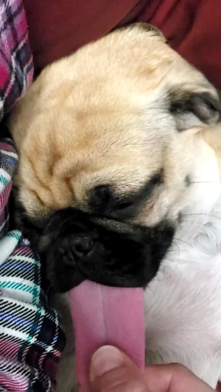A woman pulls a pug dog's tongue out of her mouth while she sleeps in the living room, and the dog continues to snore.