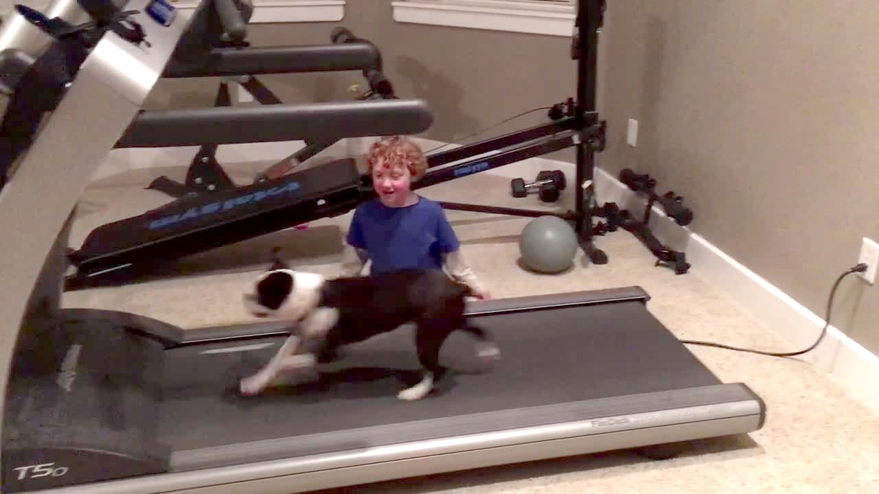 A dog jumps over a baby gate and a second dog follows and hits a couch.