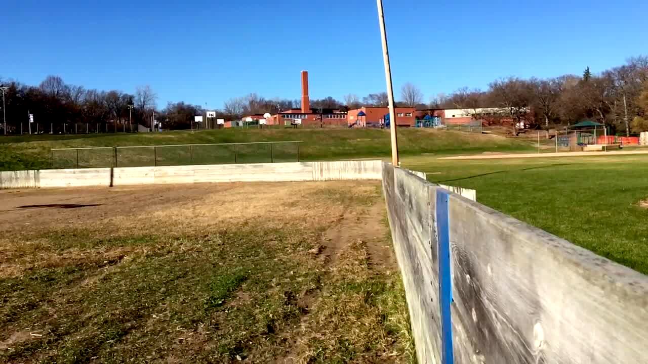 A goat faints and falls down a slide, then gets up and looks around. Ends with 12 seconds of black screen.