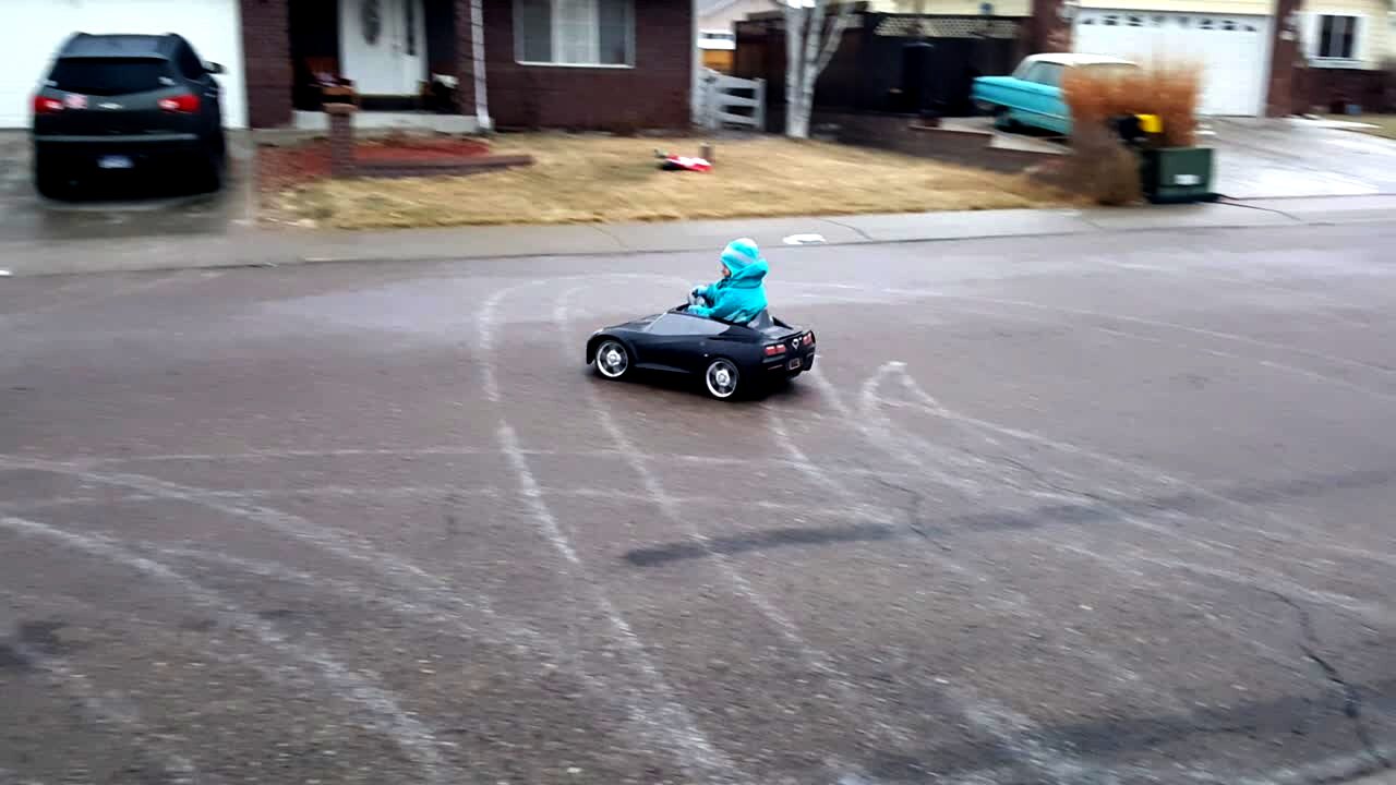 A young girl in a power wheel car spins around and does a power slide on an icy driveway.