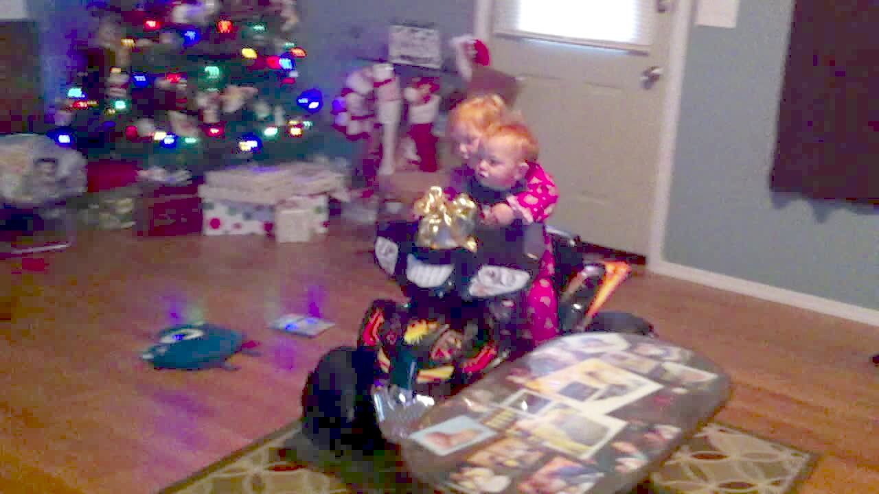 A tot girl is riding on a four wheeler inside while holding on to her baby brother. She drives into a table and knocks stuff over and says "I didn't mean to."