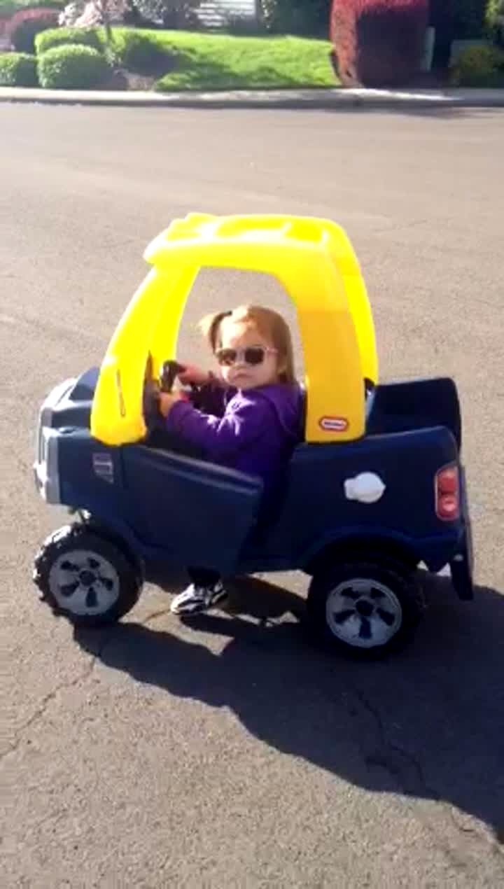 18 month old tot girl is playing in a toy car outside. Mom says turn around and she gets out of the car and spins in circles. Start at 0:25.