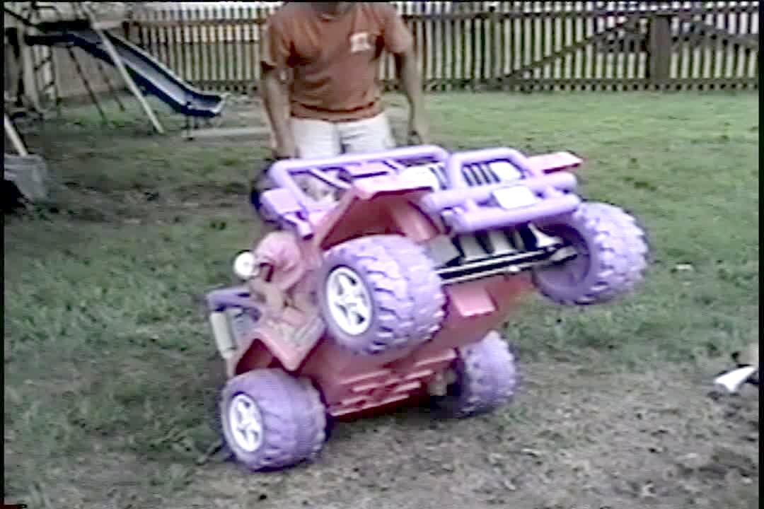 Tot girl drives a green Jeep around the yard with her little brother in the back seat. Boy stands up, girl drives faster, & boy falls out of Jeep. Short tail, no recovery. Boy cries. Power Wheels.