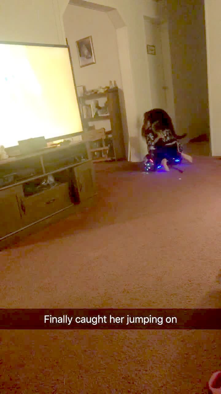 A young girl kneels on a hoverboard and rides it in a house. A puppy dog climbs on to her back in a living room and rides with her. Snapchat video.