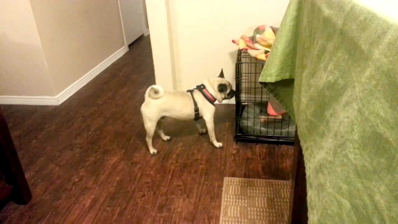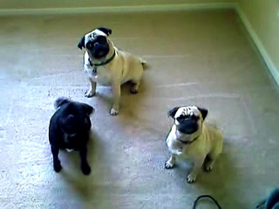 Pug dog and boxer dog viciously bark at a fake pug dog statue. Living room.