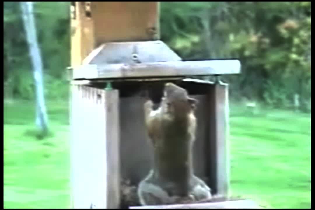 2 squirrels fight while on a bird feeder. 1 squirrel is inside & 1 is trying to get in. They make weird noises. VIDEO IS VERY BRIGHT.