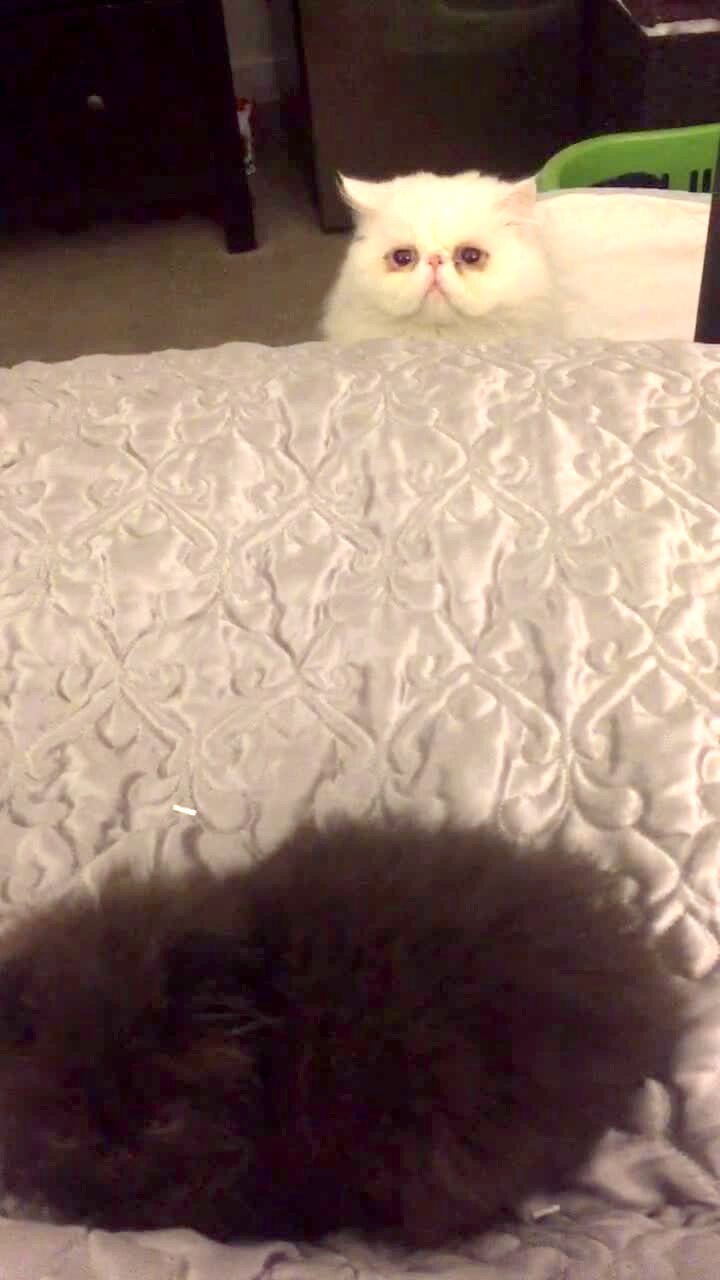 A fluffy brown kitten cat lies on a bed as a jealous white fluffy cat peeks over the edge of the bed.