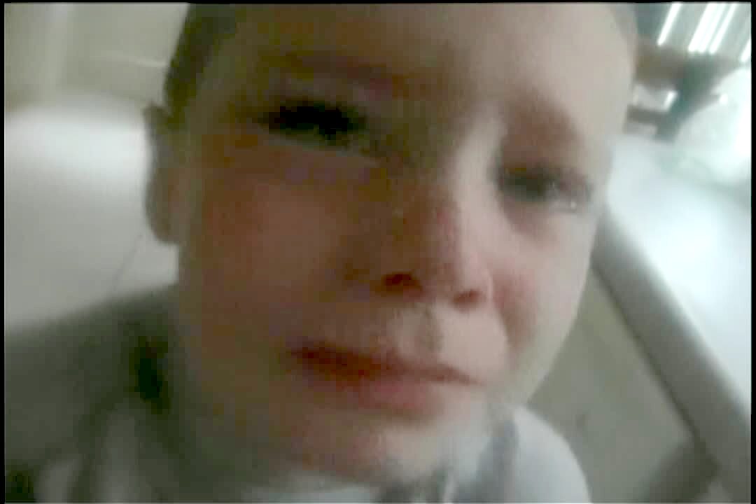 A woman helps a tot boy put mentos into a bottle of diet coke outdoors but when the soda shoots out, it hits the boy in the face and he runs away crying.