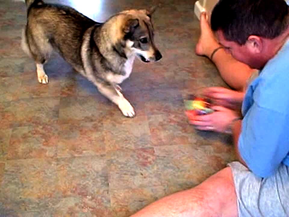 DOUBLE SUBMISSION. Man pretends that he's trapped a laser pointer light under a bowl. Cute dog chases it and barks. SAME CLIP AS 646198.