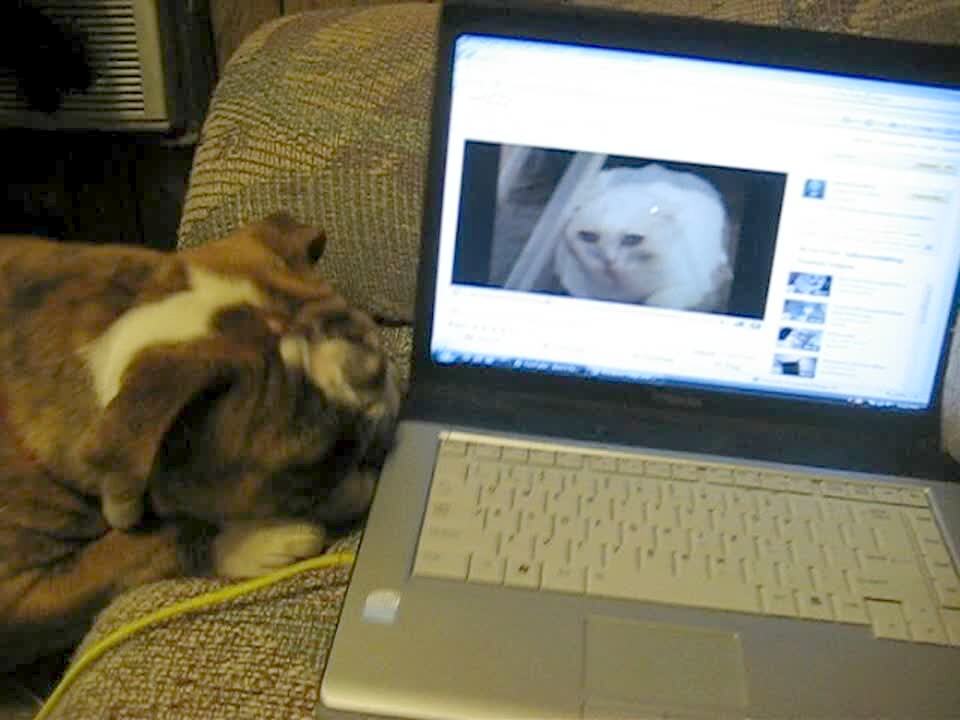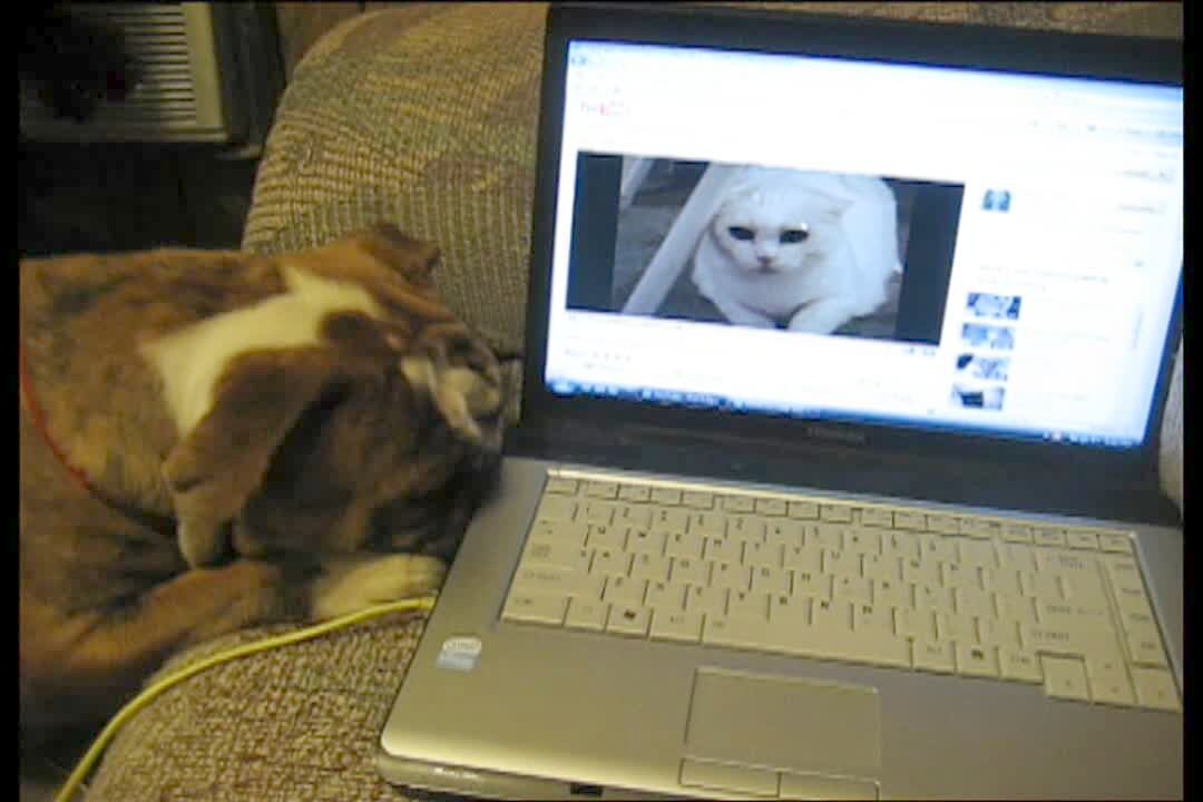 Bulldog watches and barks at cat on the computer screen. He moves the laptop trying to get the cat. SAME CLIP AS 644281 ON 4W-08 @ 8:08:59.