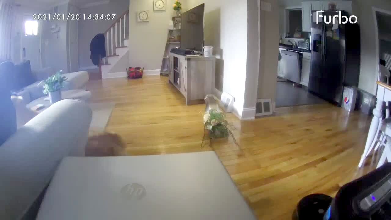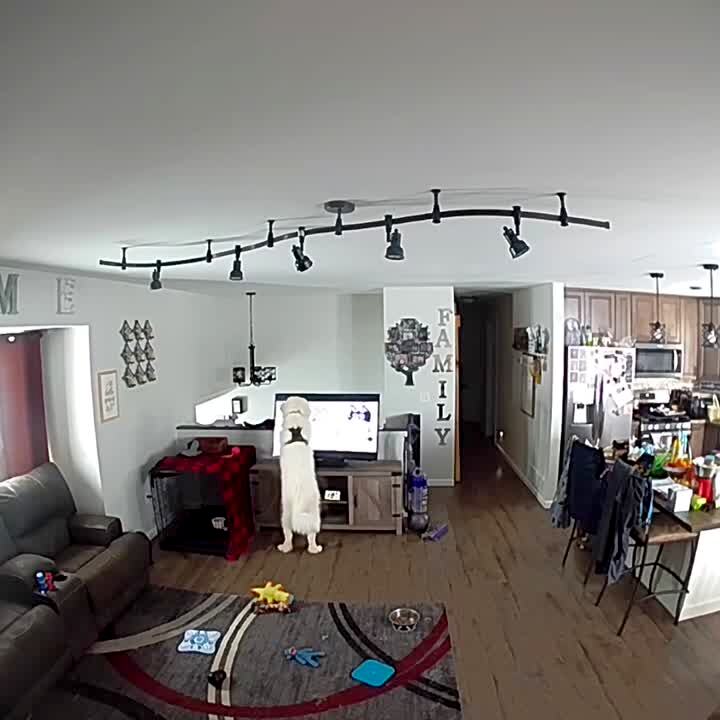 A large dog jumps up on a flat screen television on an entertainment center. The television falls on him he runs and stumbles under a bar stool in the kitchen to get away. Security Camera Footage.