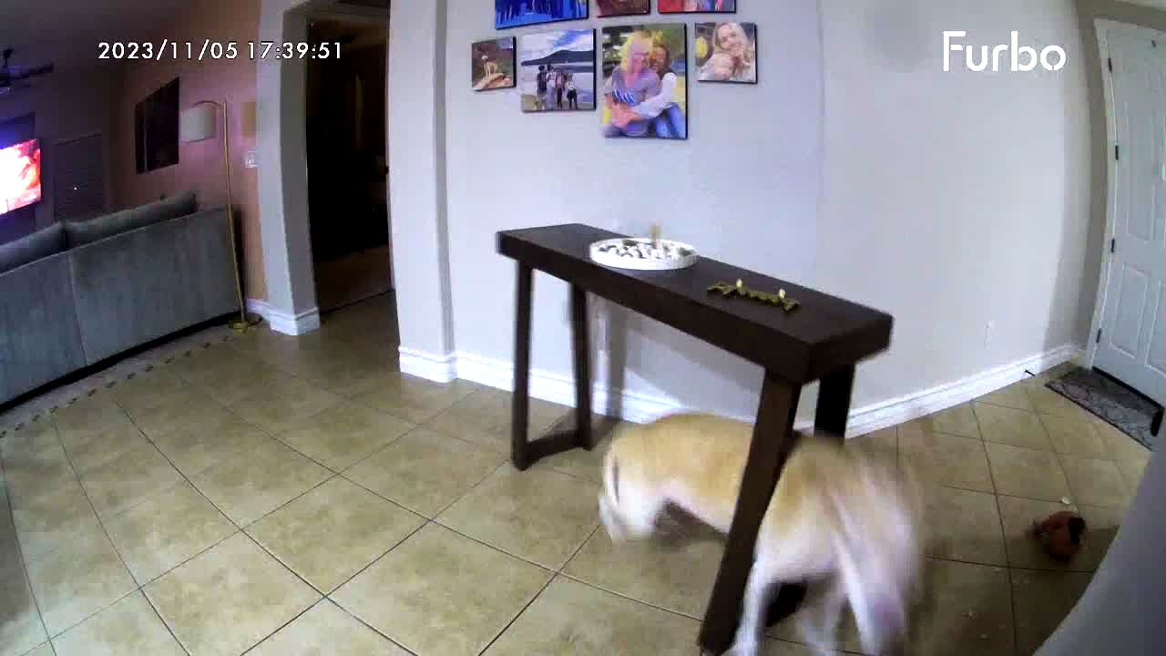 A dog walks around under a small table and gets stuck. He scrambles to get free and takes the table with him while items fall off and break. Security footage.