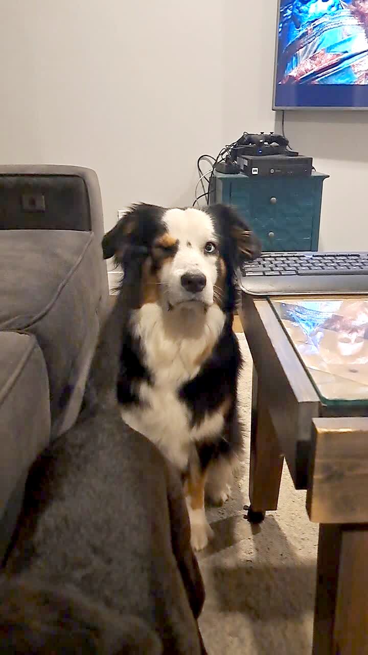 A slow-motion video of a dog that falls backwards in an attempt to catch a treat in the living room.
