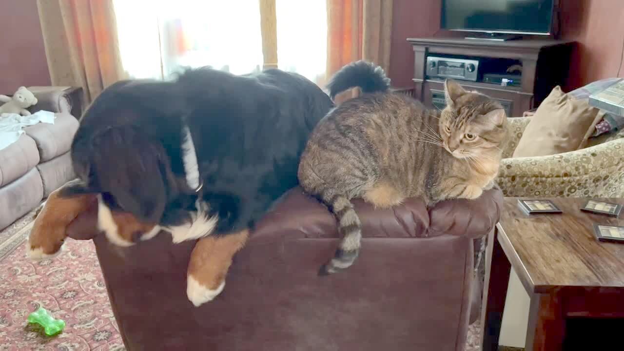 A Bernese Mountain Dog dog bites at a cat's tail while they sit on the back of a recliner chair in a living room, and the cat growls, then she hits the dog's face. The dog leans forward, then the chair tips over, and the cat and dog fall off of it.