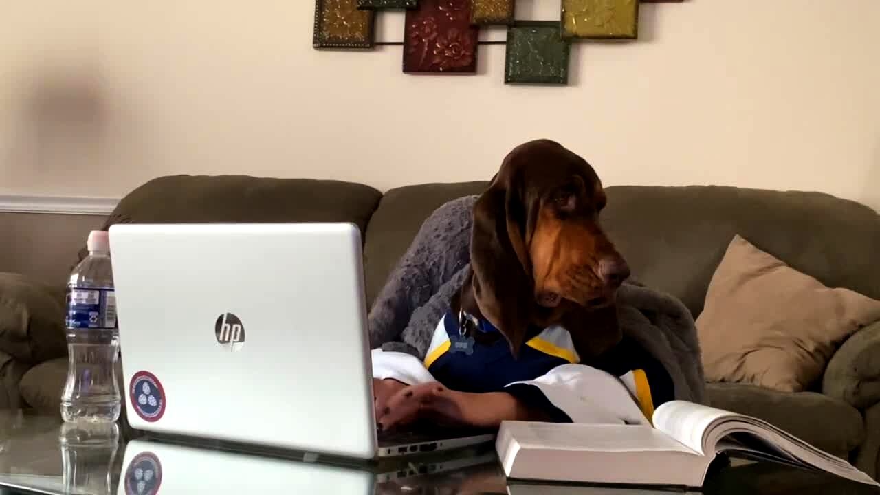 A woman does the dogs with human hands challenge and flips through a book and types on a laptop in the living-room.